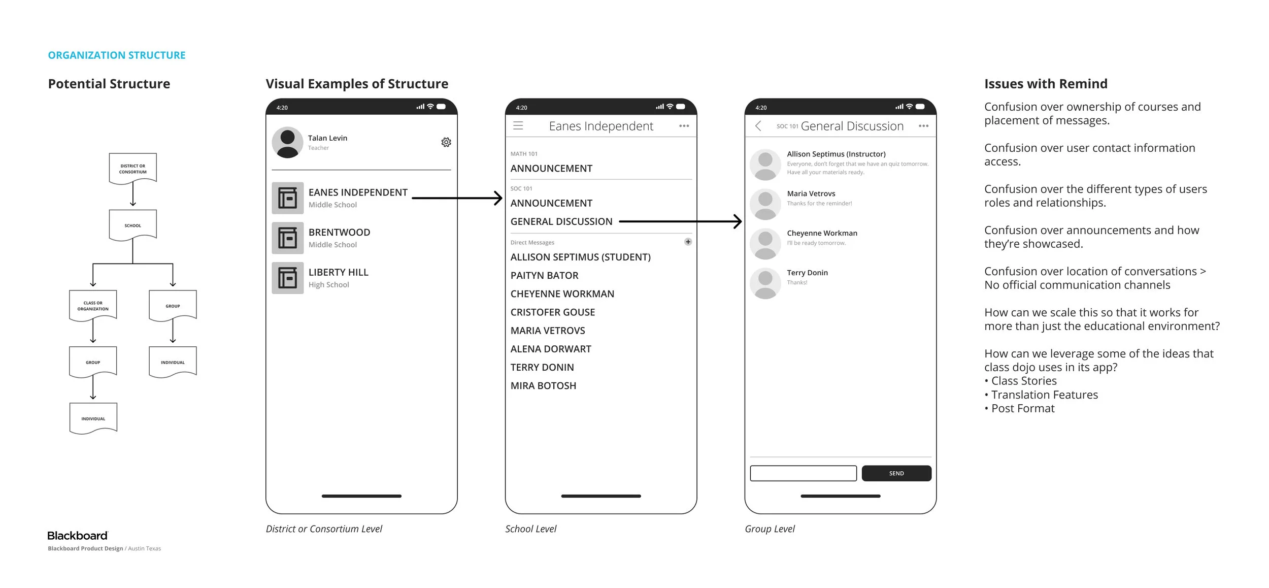 As technology and regulations around teacher/student communication evolves, K-12 schools are hungry for a tool that solves their need for two-way communication in a legal, ethical and simplified way. Blackboard was looking to fill that gap with a tool that easily integrated into its platform. The initial research, strategy and some design had begun before I was assigned this project. I supported our senior designer by managing the concept testing research, synthesis and readout, while also assisting with design and various workshops.