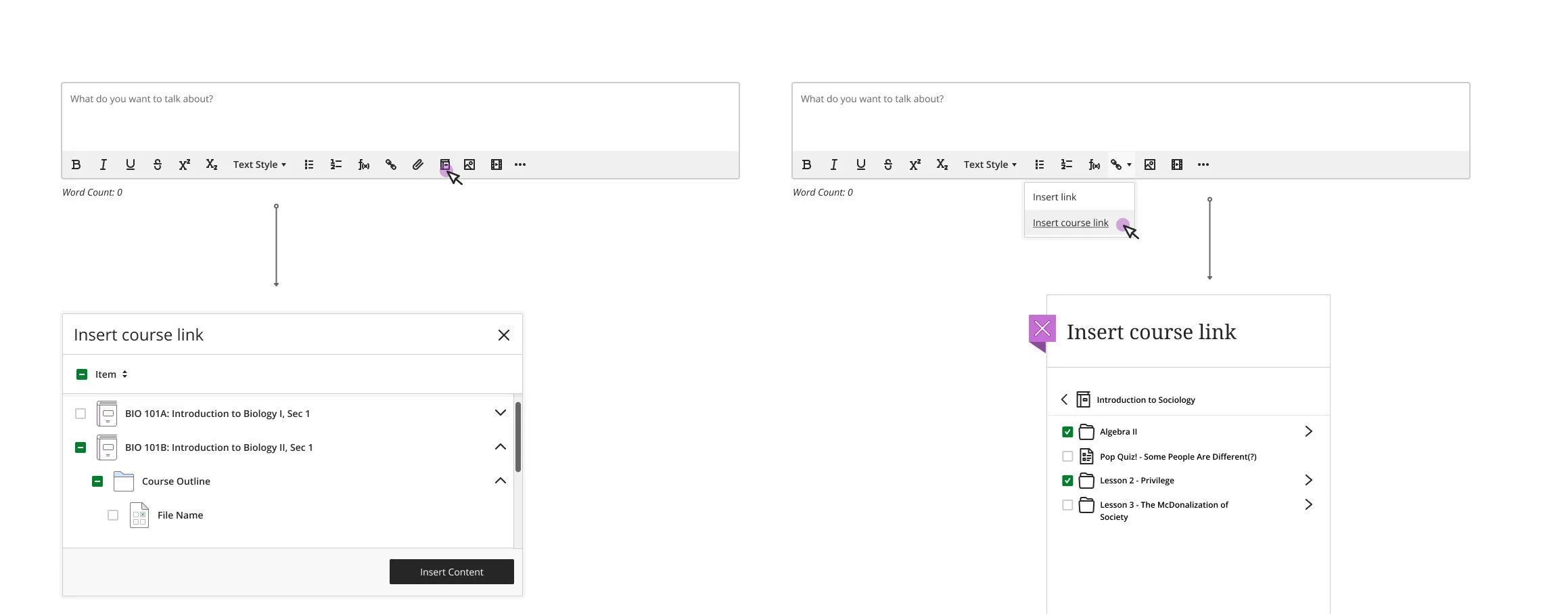 As instructors are using the rich text editor in Ultra, there are often instances where they would like to link to another piece of content (such as a document, image or folder) from the same course. Currently there is no way to easily browse course items from the Rich Text Editor and insert them into a document, message or announcement.