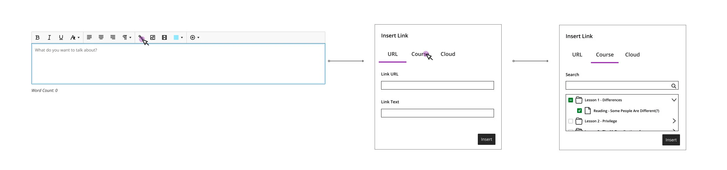 Based on the feedback received in usability testing, I felt comfortable moving forward with the prototypes I tested. I built out two detailed designs covering the different options users could have available to them when inserting a course link. These designs will be discussed with PM and dev to determine what we want to include in the first milestone.
