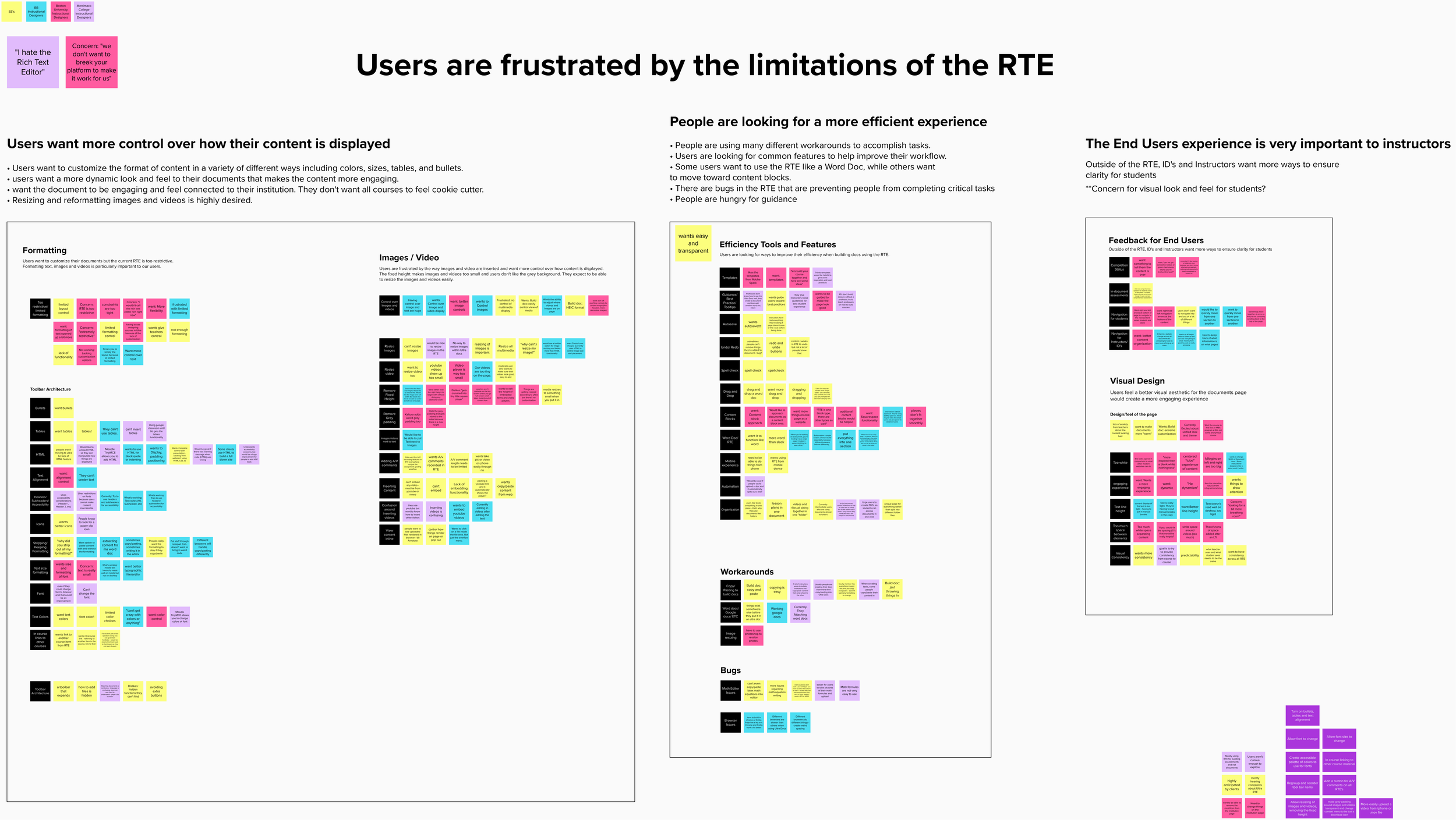 Before interviewing users, I wanted to better understand the tool. By conducting a tool audit of the current RTE, I discovered some unusual functionality. The frustrating moments I encountered allowed me to better empathize with instructors trying to build documents.